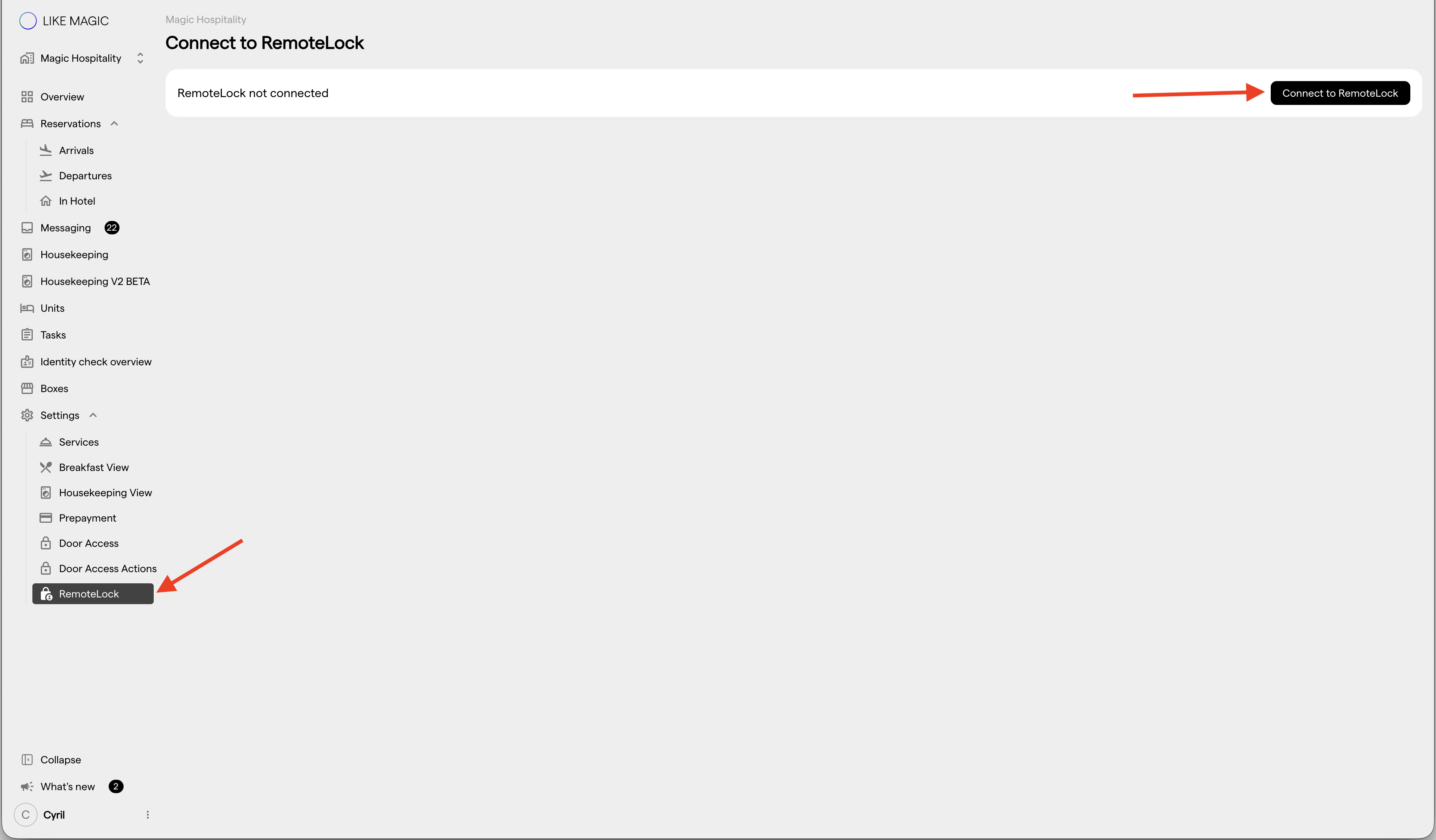 Connecting your RemoteLock system to LIKE MAGIC is simple and secure. The connection happens through an authorization process where you grant LIKE MAGIC access to manage your locks and guests.