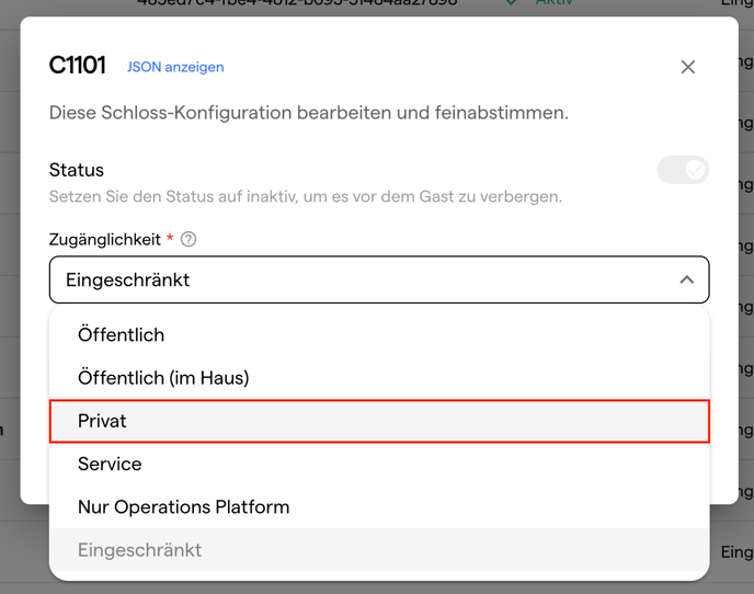 Zu Beginn werden die Schlösser als "eingeschränkt" eingeordnet, und müssen die zutreffende Zugänglichkeit erhalten. Im Falle von Zimmertüren müssen jene auf "Privat" umgestellt werden: