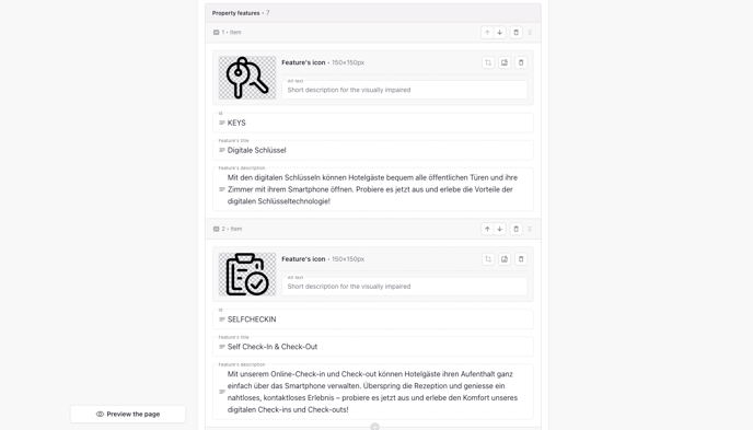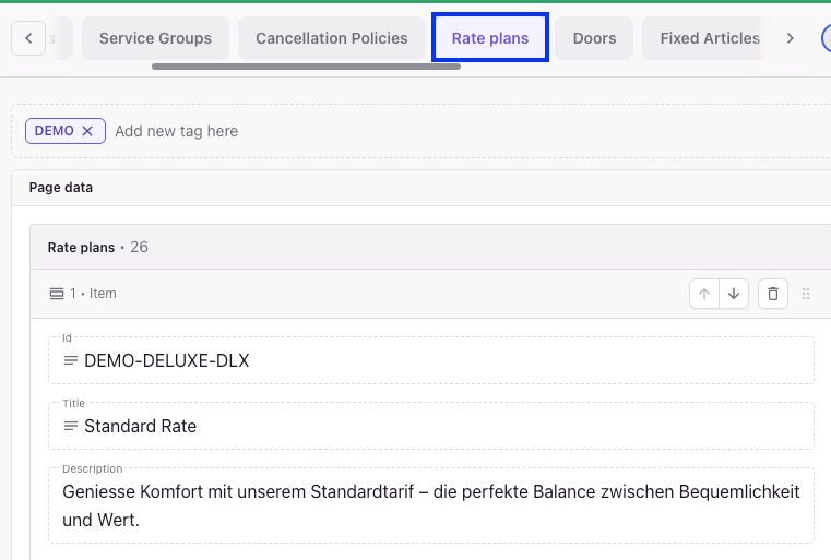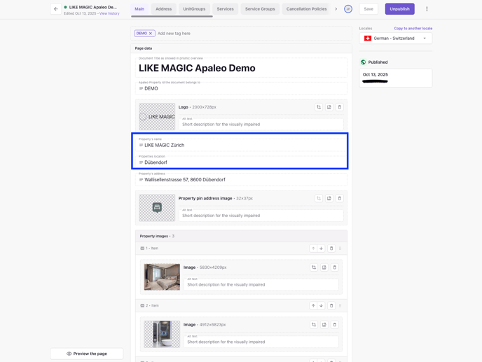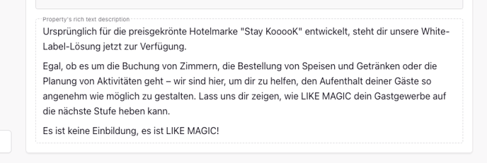 Als Erstes muss die PMS Property ID unter dem Feld Apaleo Property ID eingegeben werden. Dieses Feld befindet sich direkt unter dem Titel. Die PMS Property ID findet ihr in eurem PMS (Property Management System). Ohne diese ID wird der eingefügte Content nicht auf der IBE angezeigt, daher ist sie unerlässlich für die korrekte Darstellung der Property.