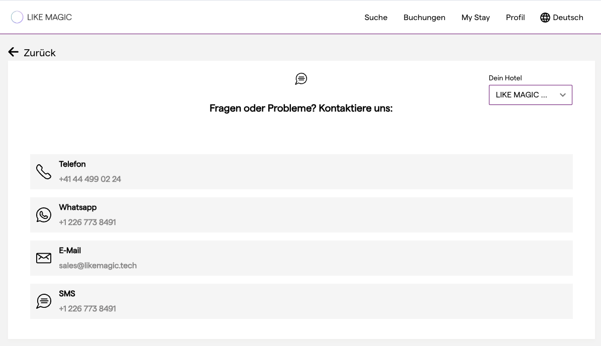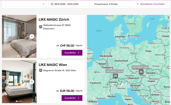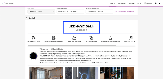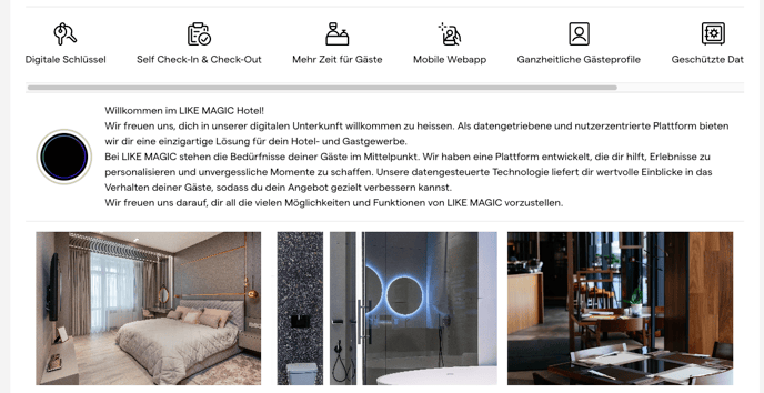 Unter diesem Sektor werden die allgemeinen Unterkunftsinformationen sowie Bilder und Ausstattungsdetails eingegeben, damit die Property später auf der IBE (Internet Booking Engine) wie gewünscht angezeigt wird. Hier findest du unsere LIKE MAGIC IBE und wie das Beispiel-Prismic online ausschaut.
