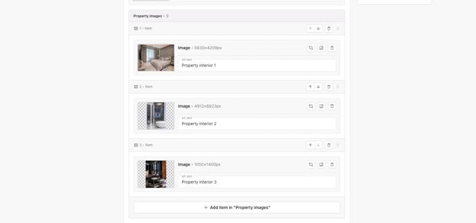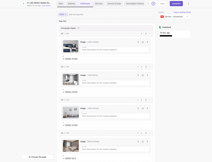 Zuerst kannst du die Unit Group Images hochladen. Klicke dazu auf "Add item in "Unit groups images"" um ein Bild im Format von ca. 900x1400 Pixel hochzuladen. Diese Bildgrösse empfehlen wir,da sie die optimale Qualität bietet und gleichzeitig sicherstellt, dass die IBE nicht durch zu grosse Dateien verlangsamt wird.