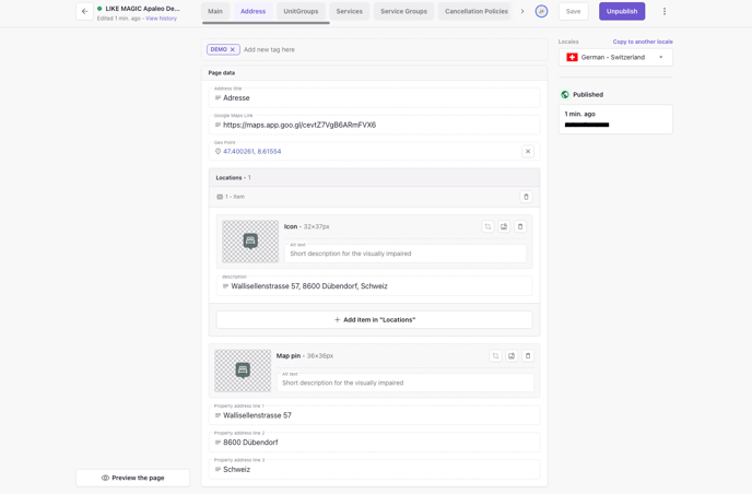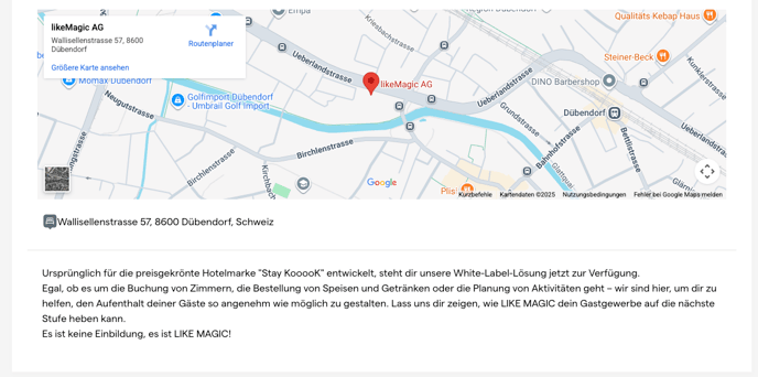 Diese Informationen sind entscheidend, damit die korrekte Adresse der Unterkunft auf der IBE (Internet Booking Engine) angezeigt wird. Der Adressentitel beschreibt die Art der Adresse (z. B. "Wallisellenstrasse 57, 8600 Dübendorf"), während der Google Maps Link den direkten Zugriff auf die Karte ermöglicht und der Geo Point anhand den Koordinaten die genaue geografische Position markiert.