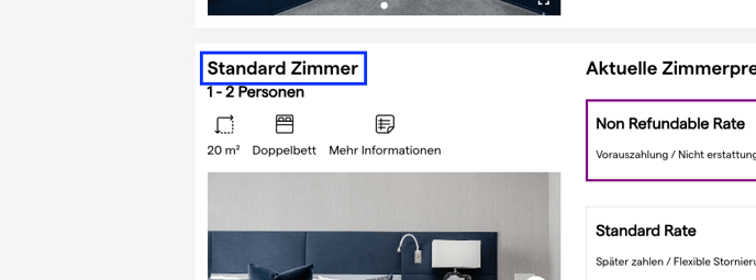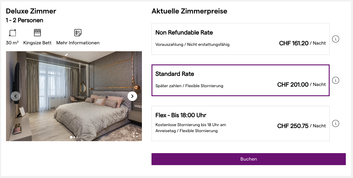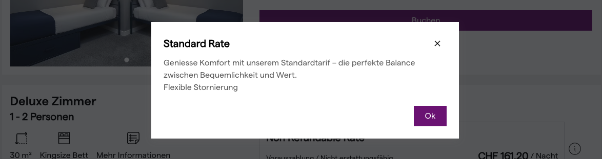 In diesem Beispiel wird die Rate „Standard Rate“ angezeigt, und die zusätzlichen Informationen wie „Stornierung bis 24h vor Anreise“ und „Flexible Rate inklusive Frühstück“ erscheinen in der Infobox hinter der Rate, um den Gästen mehr Klarheit über die Bedingungen zu geben.