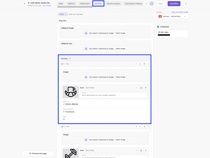 - Dem Service einen Titel geben – z. B. „Frühstück“, damit der Service klar und verständlich für die Gäste angeboten wird.