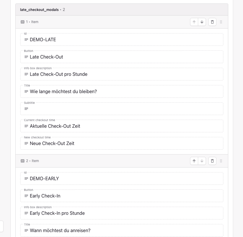 Hier werden Late Check-out und Early Check-in eingetragen, da diese spezielle Modals benötigen.