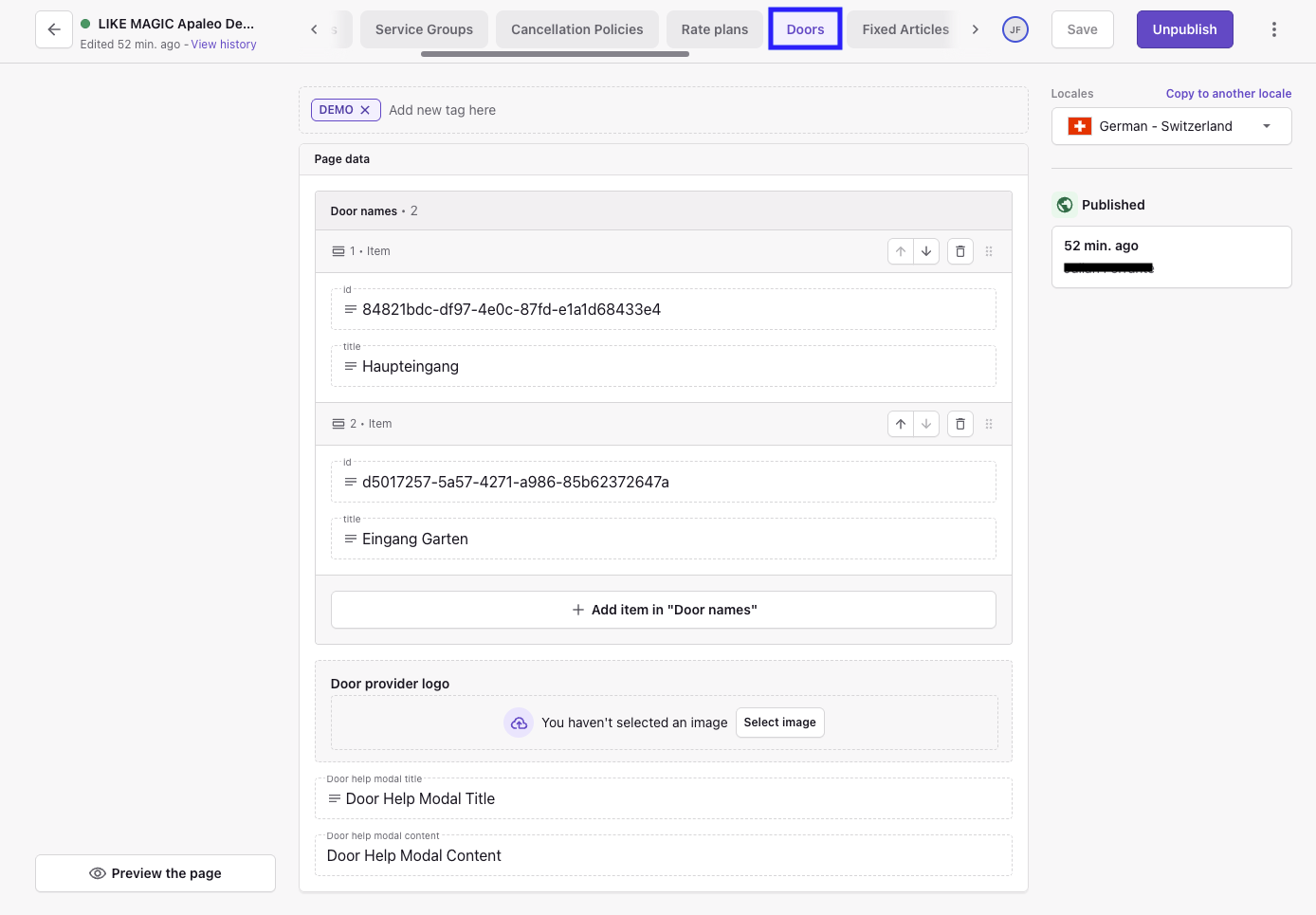 Unter Doors kannst du die Tür-Bezeichnungen festlegen, damit die verfügbaren Türen vom Gebäude wie gewünscht auf der Gästeplattform angezeigt werden. Auch hier wird die ID (UUID) benötigt, jedoch kommt diese nicht aus dem PMS, sondern vom Tür-Schliesssystem.