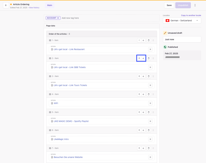 Mit dem Article Ordering steuerst du, in welcher Reihenfolge deine Artikel im Digital Guest Portal angezeigt werden. So behältst du die volle Kontrolle über die Präsentation deiner Inhalte und kannst sicherstellen, dass die wichtigsten Informationen immer im Fokus stehen.