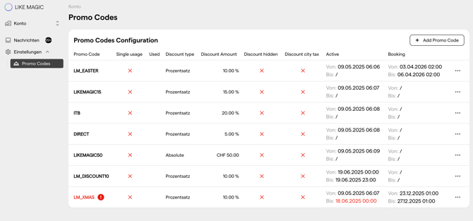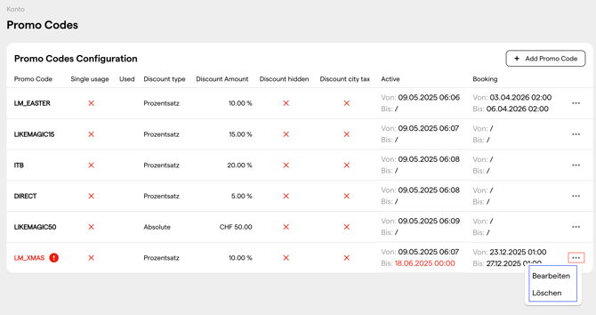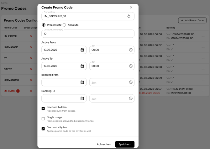 | Kurtaxen-Rabatt | Wenn aktiviert, reduziert der Code auch die Kurtaxe |
