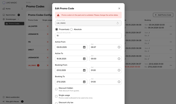 Klicke auf „+ Promo Code hinzufügen“, um ein Modal zur Erstellung zu öffnen. Felder: