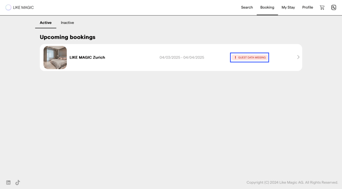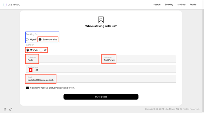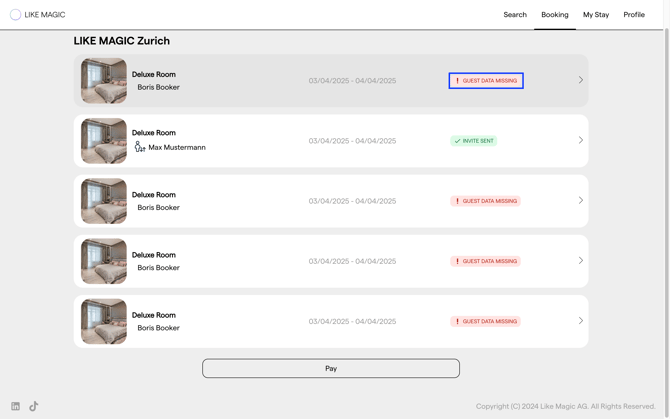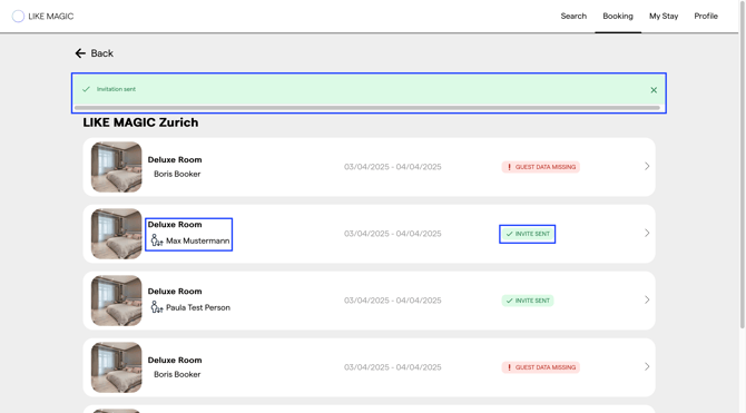 Once the guest has been correctly invited, LIKE MAGIC will confirm this in the Booking Overview after clicking the “Invite Guest” button.