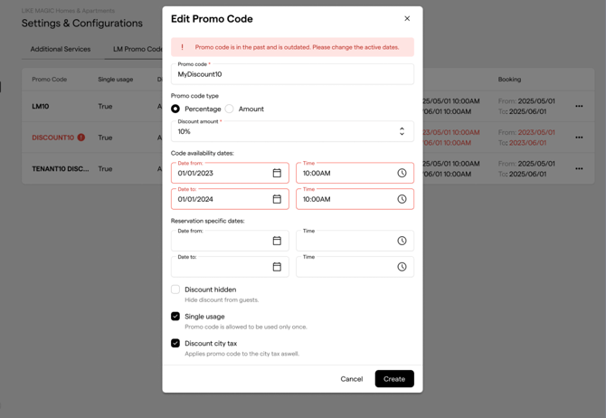 Overlapping date windows (availability and reservation dates) may result in ineligible promo code
