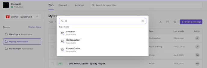 Using the Prismic document type Configuration, the navigation items can be managed manually. To do so, create a new Configuration document in Prismic by clicking the purple button on the right labeled "Create new". You will then be prompted to select the document type you wish to create.